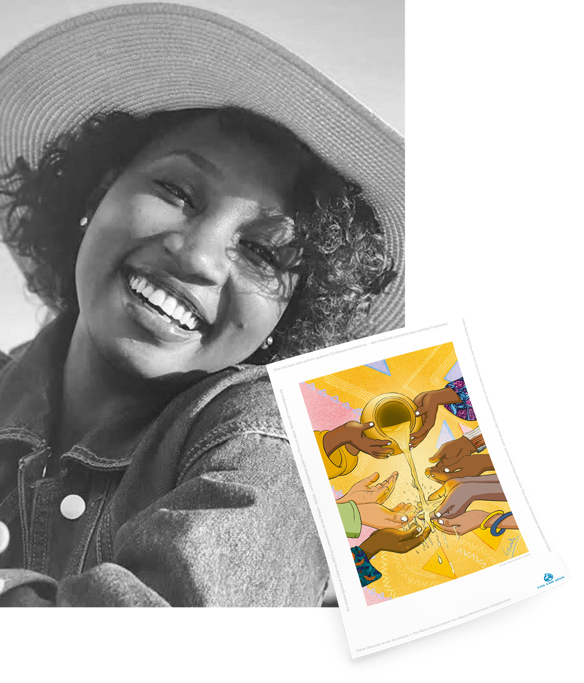 Nabwami Assumpta, genannt Ganda, aus Uganda ist Absolventin der Makerere University School of Art. Gandas Kunst ist eine Widerspiegelung ihrer Selbstfindung und Hommage an ihr ugandisches Erbe. In ihrer kreativen Tätigkeit verbindet sie gekonnt Realismus mit halbabstrakten, lebendigen Hintergründen.