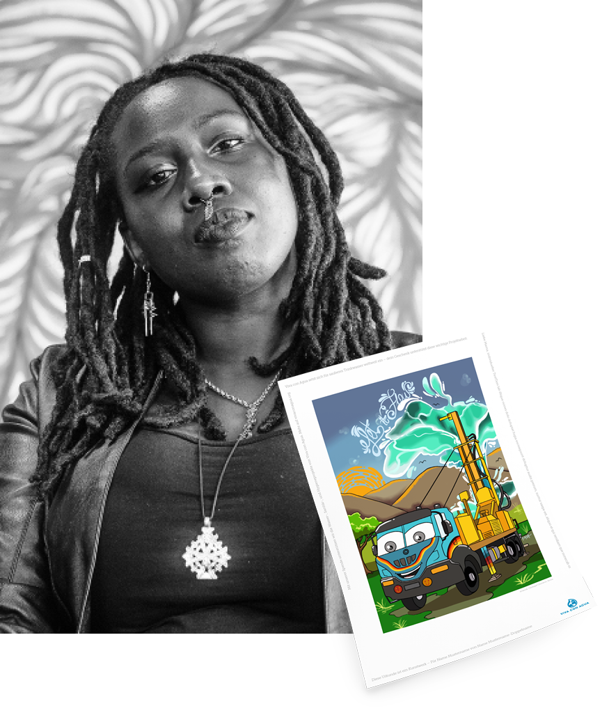 Chelwek ist eine kenianische Künstlerin, die mit Farben in verschiedenen Medien zwischen digitalem Raum und Graffiti-Wandbildern herumspielt. Sie erschafft exzentrische Stücke, die auf afrikanischer Mystik und Spiritualität basieren, während sie sich vor allem für den Feminismus einsetzt.
