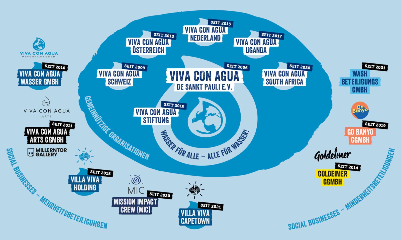 Auf der einen Seite haben sich außerhalb Deutschlands Viva con Agua NGOs gebildet: Vereine wie in Deutschland, in denen engagierte Menschen gemeinsam Aktionen für Wasser machen und Spenden generieren. Es gibt gemeinnützige Viva con Agua-NGOs in Deutschland, Österreich, Schweiz, den Niederlanden, Uganda und Südafrika. Das ist der gemeinnützige Kern der Viva con Agua-Family. Sie unterstützen Wasserprojekte weltweit.