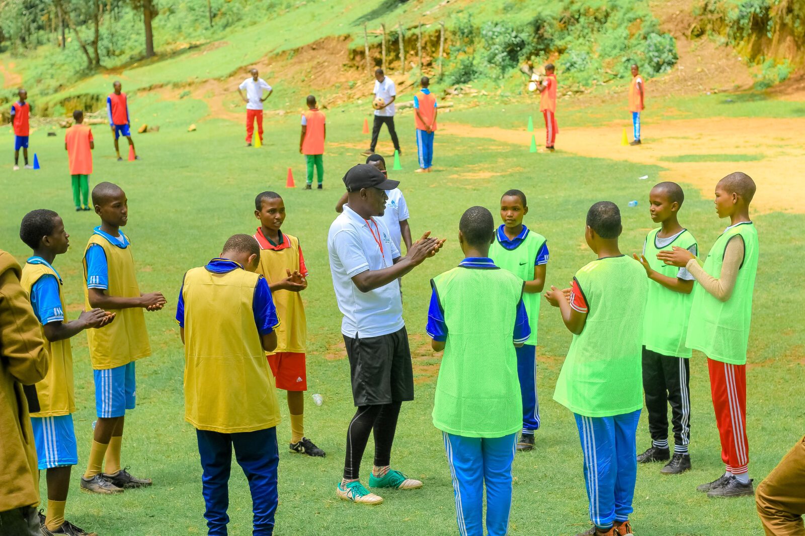 Burhani (mitte, in weiß) erklärt den Schüler*innen ein Football4WASH Drill.