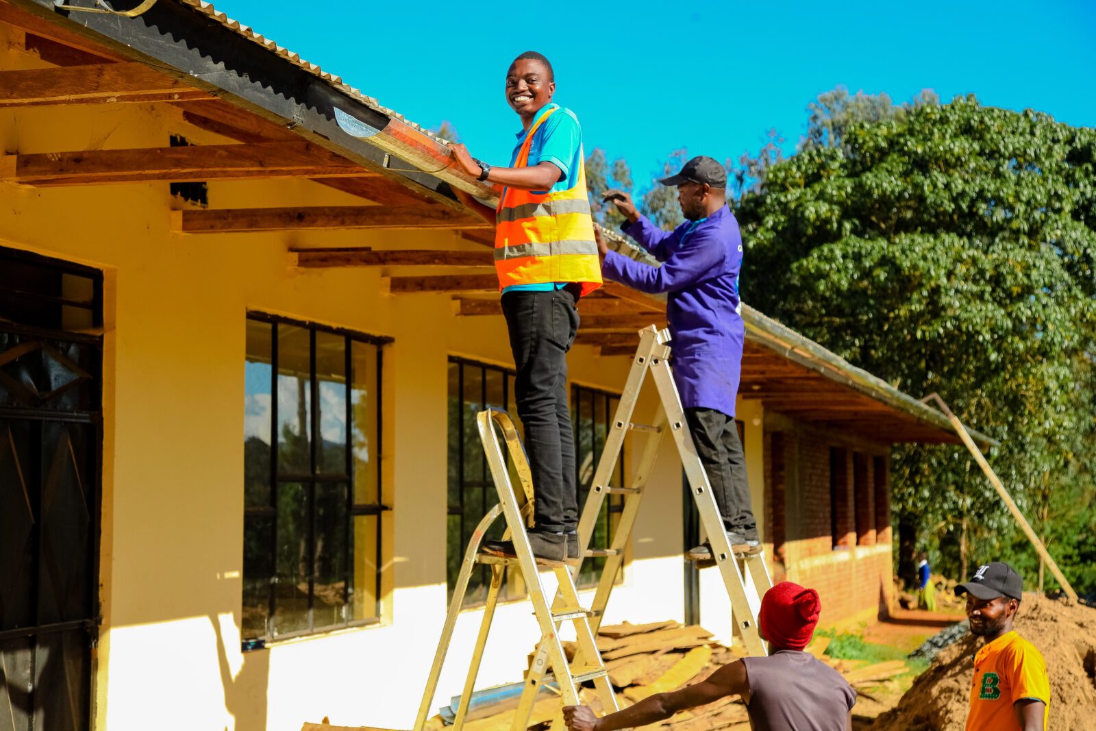 Baraka (1.v.l.) beim Bau einer Regenauffanganlage an einer Schule in Tansania.
