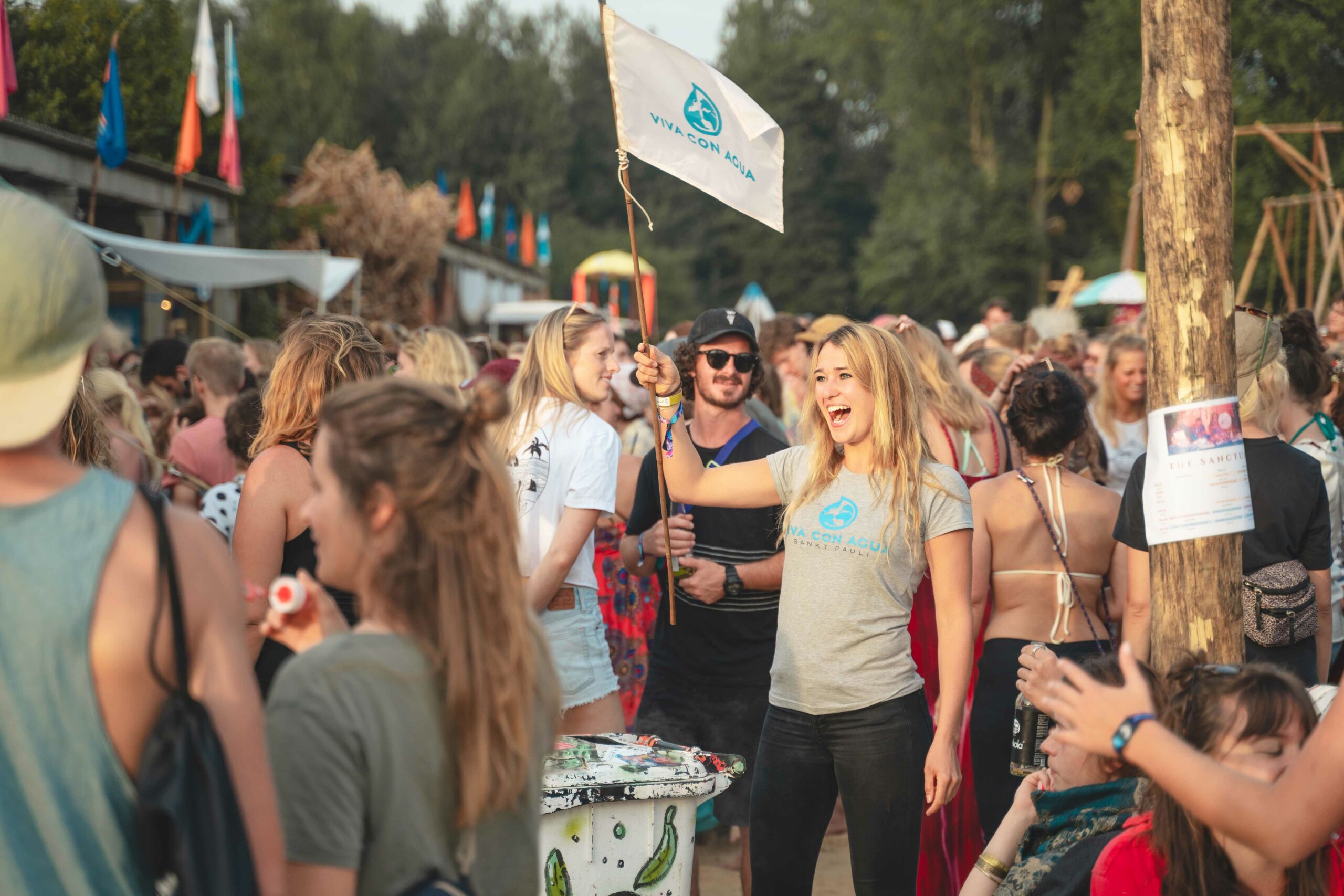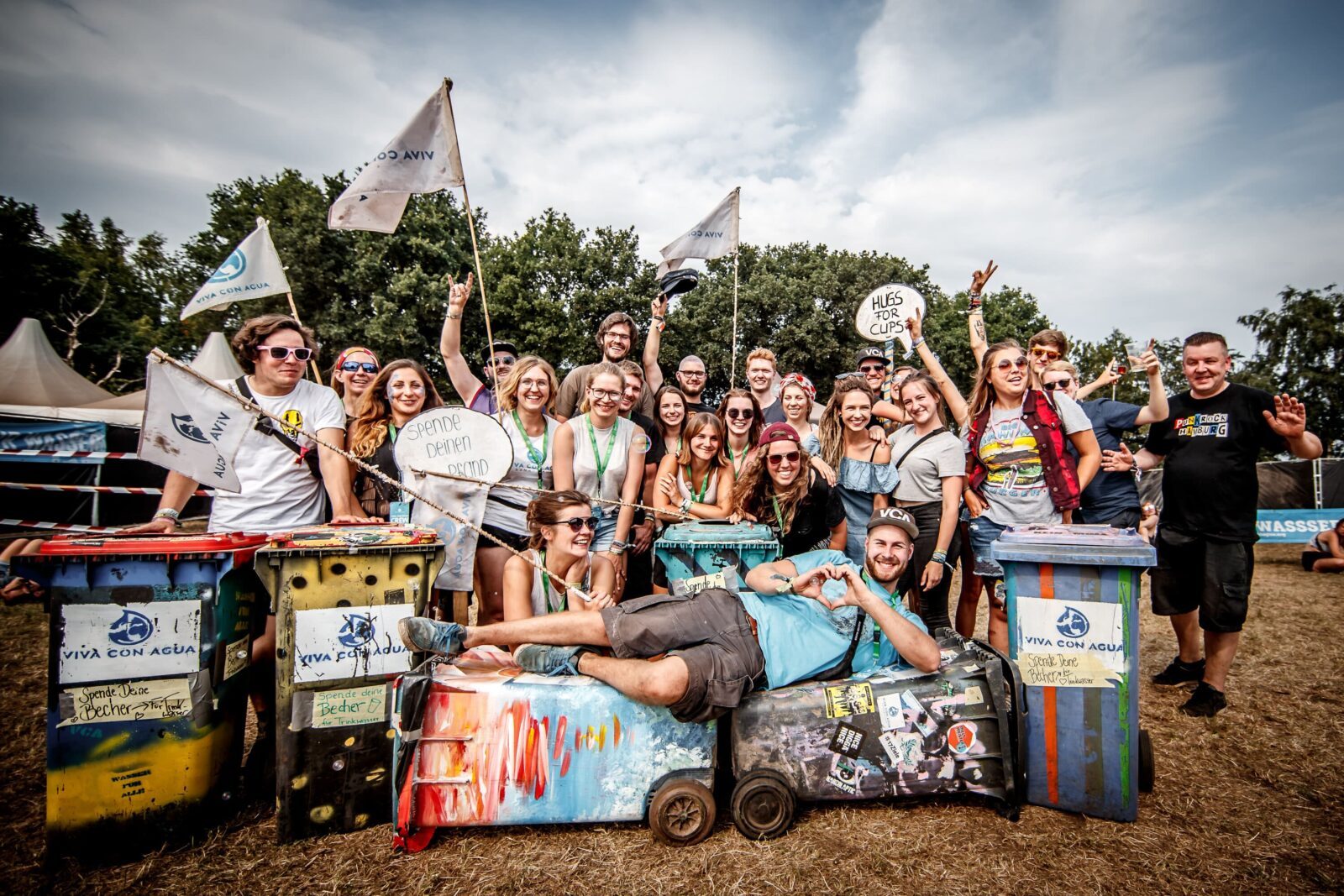 Seit 2007 sammeln Supporter*innen, Bands und Künstler*innen auf Festivals, Konzerten oder auch in Fußballstadien Pfandbecher für sauberes Trinkwasser. Die ursprüngliche Idee stammt von Moritz Meier, einem ehemaligen Marketing-Chef von Viva con Agua de Sankt Pauli e.V. Da beim Lüneburger Lunatic Festival eine Ticketspende nicht mehr gestattet war, suchte Moritz eine neue Möglichkeit, Geld für sauberes Trinkwasser zu sammeln. Eine umfunktionierte Mülltonne und ein kleiner Basketballkorb, und schwupps, das Konzept der Pfandbecherspende war geboren. Aus einer Pfandtonne wurden im Laufe der Jahre ganz viele bunte Pfandtonnen und aus einem Festival ein ganzes Lineup an Festivals und Konzerten. Seitdem zieht die Viva con Agua Familie mit den Pfandtonnen jedes Jahr von Festival zu Festival und von Konzert zu Konzert und bringt den Menschen vor Ort die Idee und Vision von Viva con Agua näher. Gleichzeitig werden Spenden für den guten Swag gesammelt. In den letzten 2 Jahren war dies leider nur sehr eingeschränkt möglich. Nicht nur die fehlenden Einnahmen schmerzten, auch der Austausch mit all den interessierten Menschen und Engagierten fehlte. Dieser langgezogene Winterschlaf ist jetzt vorbei.