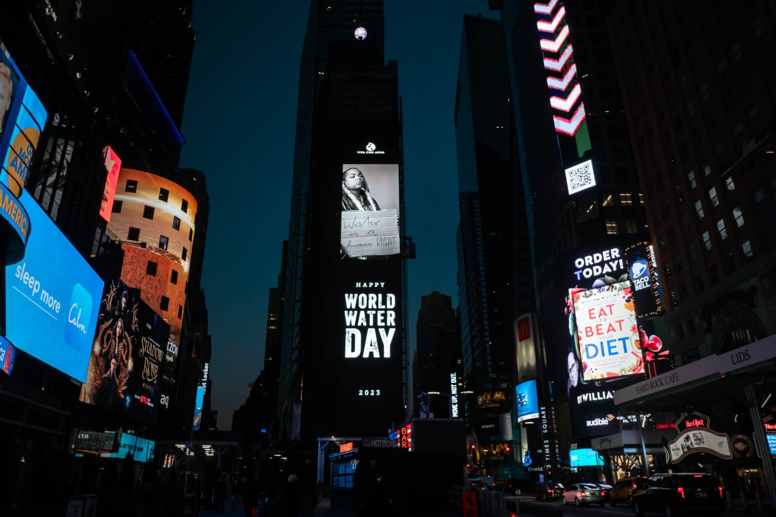 Ausrufezeichen: Das Viva con Agua-Statement #WaterIsAHumanRight erleuchtet am Times Square – ermöglicht durch engagierte Supporter von Viva con Agua