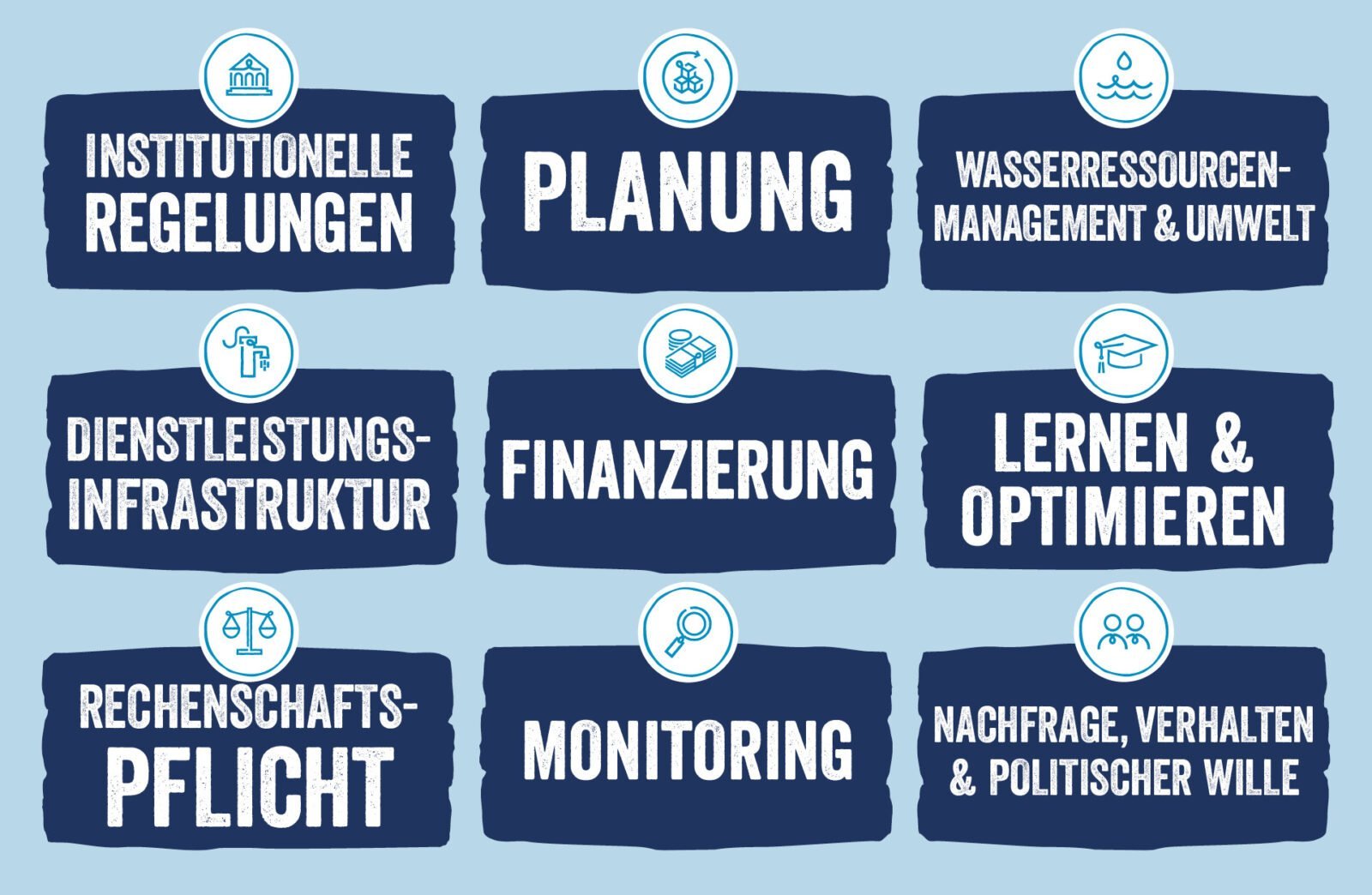 Ein WASH-System ist in neun Funktionsbereiche unterteilt. Nur in ihrem Zusammenspiel ermöglichen sie, dass das Wasser beständig fließt!