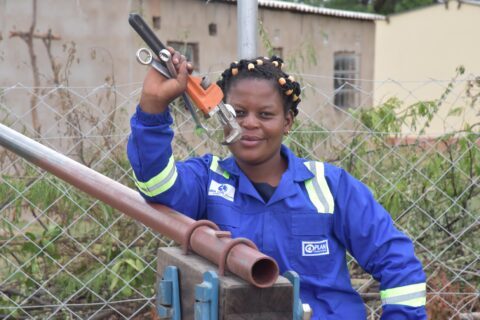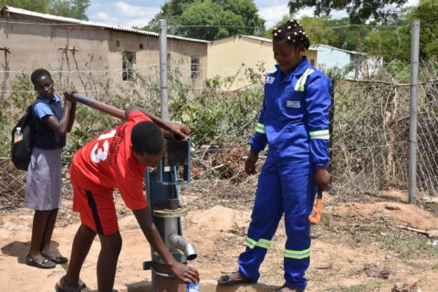 Ich heiße Nomsa Nkunzi, bin 24 Jahre alt und komme aus Santa Maria. Das liegt unterhalb des Dorfes Mangwizi in Simbabwe. Dort arbeite ich als Pumpenmechanikerin, unter anderem für einen Brunnen der dortigen Schule. Ein funktionierender Brunnen ist für die Schüler*innen besonders wichtig. Nur mit dem Wissen, dass es hier fließend Wasser gibt, können sie jeden Tag sorgenfrei zur Schule gehen. Deshalb ist für mich diese Arbeit nicht nur irgendein Job. Ich bin mir der Bedeutung der Aufgabe stets bewusst und freue mich, einen Beitrag zu leisten, damit die Kinder gerne in die Schule gehen.
